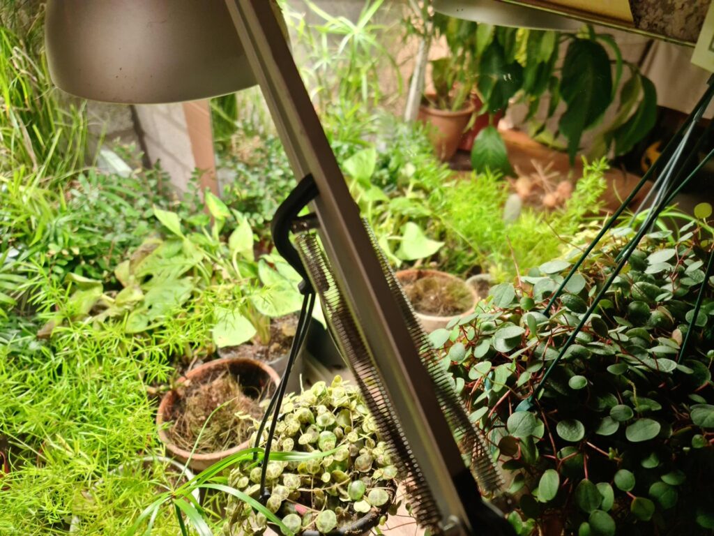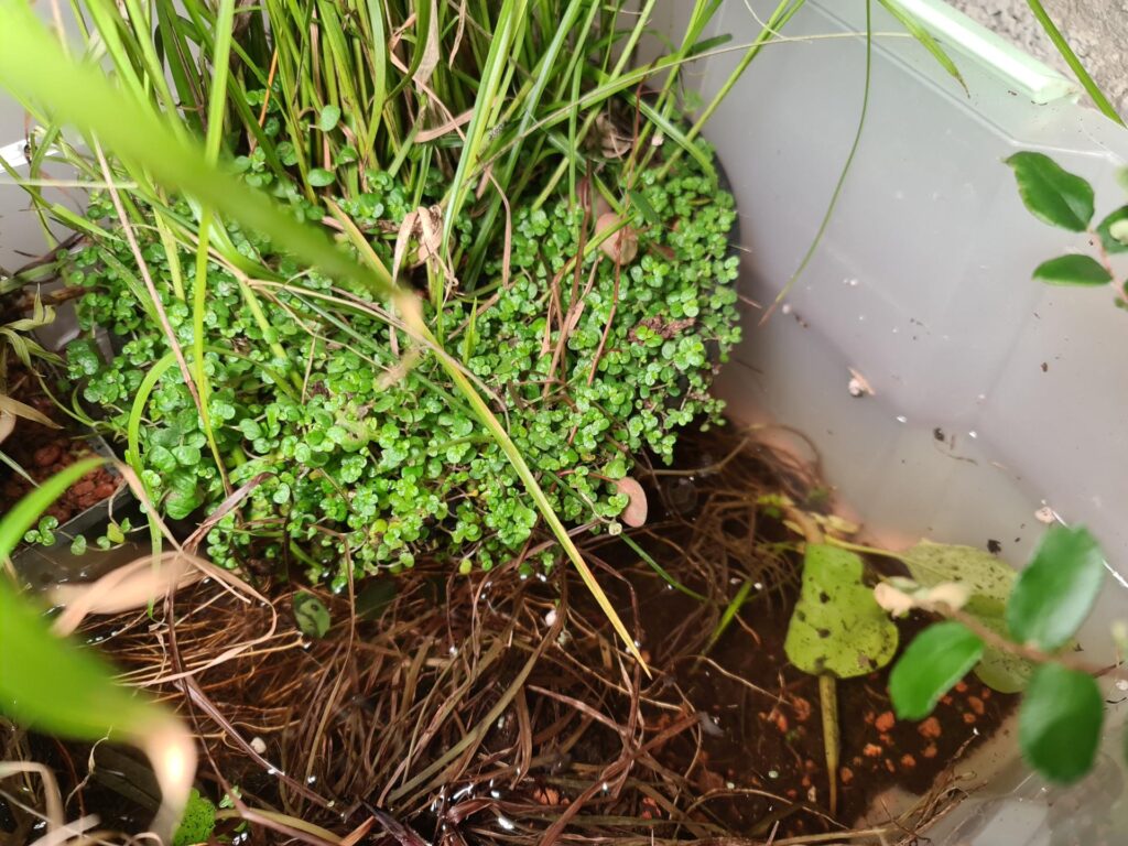 Ik heb ook een plastic opbergbak met water waar ik een paar vijverplanten in heb staan die niet tegen vorst kunnen. Er zit een aquarium verwarmingselement in, waardoor het water rond 17 graden zou moeten zijn. Er zitten wat waterslakken en een soort mini-garnaaltjes in die uit de sloot komen. Die zijn door de warmte een stuk actiever geworden. Ik zag ook ergens een mug, die waarschijnlijk door de warmte nu uit is gekomen. Later ga ik hier wat visjes bij doen, die eten de muggenlarven in het water.
